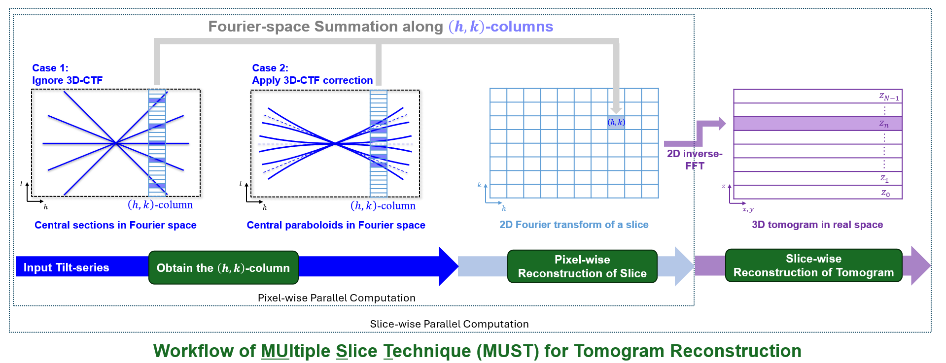 近日,精品无码久久久久久久久_国产精品一区二区三区四区五区_欧美亚洲国产激情一区二区_午夜精品久久久久久久久久久久_亚洲欧洲中文日韩久久AV乱码_91精品欧美一区二区三区_久久精品一区二区免费播放_日韩高清大片永久免费入口_久久国产欧美日韩精品免费_欧美一区二区三区久久综合_国产精品天天狠天天看生命学院李雪明副教授课题组和电子系沈渊教授课题组联合在《超显微镜》(Ultramicroscopy)在线发表题为“基于傅里叶空间的冷冻电子断层成像多层重建方法”(Fourier-based multiple-slice reconstruction in cryo-electron tomography)的研究论文。论文报道了一种基于傅里叶空间的冷冻电子断层成像三维断层重建方法MUST(MUltiple Slice Technique,图1)。该方法将三维重构密度图看作是由一系列平行平面层(parallel slice,PS)组成的,通过逐层独立计算的方法来合成最后的三维图像。而对于一个平行平面层的计算是通过在傅里叶空间按像素列投影计算得到的。由于像素列的计算是互相独立的,可以实现像素级的并行计算。由此形成实空间平面级并行与傅里叶空间像素级并行的两级并行架构,可大幅提升重建效率。通过对傅里叶空间中频点的相应加权操作,MUST可以获得与基于实空间的WBP和SIRT方法衬度相似的重构结果(图2)。研究团队同时发现,在考虑样品离焦量梯度(defocus gradient)的三维衬度传递函数校正(three-dimensional contrast transfer functioncorrection,3D-CTF correction)中,傅里叶空间中的平面状的中心截面会劈裂为一对中心共轭抛物面(pairs of conjugate central paraboloids, PCCP)。